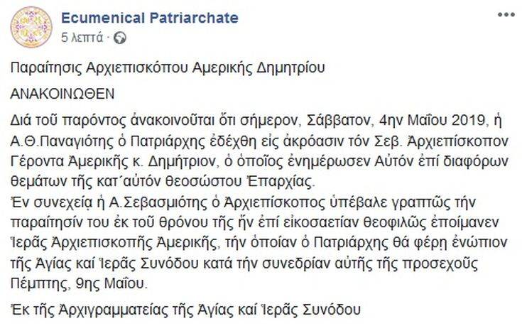 Την παραίτησή του υπέβαλλε ο Αρχιεπίσκοπος Αμερικής, Δημήτριος, στον Οικουμενικό Πατριάρχη Βαρθολομαίο μετά από συνάντηση που διήρκεσε 1,5 ώρα.