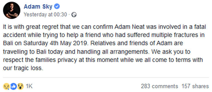 Σύμφωνα με την ανακοίνωση που έγινε στη σελίδα του Adam Sky στο Facebook, όπου έγινε γνωστός ο θάνατός του «στο Μπαλί έχουν ήδη μεταβεί συγγενείς και φίλου του Νιτ για να προχωρήσουν με τις γραφειοκρατικές διαδικασίες».
