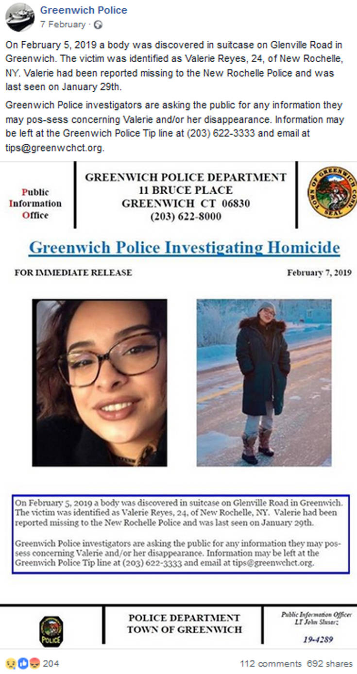 Η 24χρονη Valerie Reyes πέθανε από ανθρωποκτόνο ασφυξία προτού βρεθεί μέσα στη βαλίτσα το πρωί της 5ης Φεβρουαρίου στην άκρη του δρόμου, σύμφωνα με τους ιατροδικαστές.