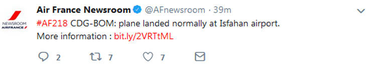 Η πτήση AF218 κατευθυνόταν από το Παρίσι στη Μουμπάι της Ινδίας, όταν χάθηκε από τα ραντάρ και άρχισε να έχει καθοδική πορεία για άγνωστο εκείνη τη στιγμή λόγο, για να προσγειωθεί τελικά στο Isfahan το απόγευμα της Τετάρτης.