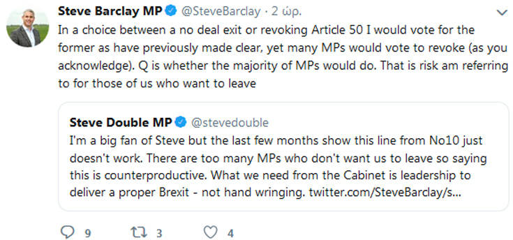 «Αντιμετωπίζουμε τον πραγματικό κίνδυνο, υπνοβατώντας, να παραμείνουμε στην ΕΕ» έγραψε στην εφημερίδα Sun ο υπουργός αρμόδιος για το Brexit, ο Στίβεν Μπάρκλεϊ. «Αυτός είναι και ο λόγος που θεωρώ ότι θα ήταν ασυγχώρητο για την κυβέρνηση να μην εκμεταλλευθεί τους επόμενους μήνες για να συνεχίσει να προετοιμάζεται για τον πραγματικό κίνδυνο να αποχωρήσουμε από την ΕΕ χωρίς συμφωνία». Ο ίδιος έγραψε αργότερα στο Twitter ότι αν η επιλογή ήταν έξοδος χωρίς συμφωνία ή παραμονή στην ΕΕ θα ψήφιζε το πρώτο.