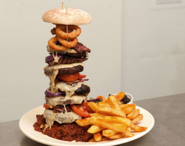 Όσοι τολμούν να το παραγγείλουν πρέπει να καταναλώσουν μέσα σε 20 λεπτά ένα χάμπουργκερ που αποτελείται από έξι μπιφτέκια, έξι φέτες μπέικον, τηγανητές πατάτες και δαχτυλίδια κρεμμυδιού, μαζί με μπόλικη καυτερή σάλτσα με κιμά ενδιάμεσα.