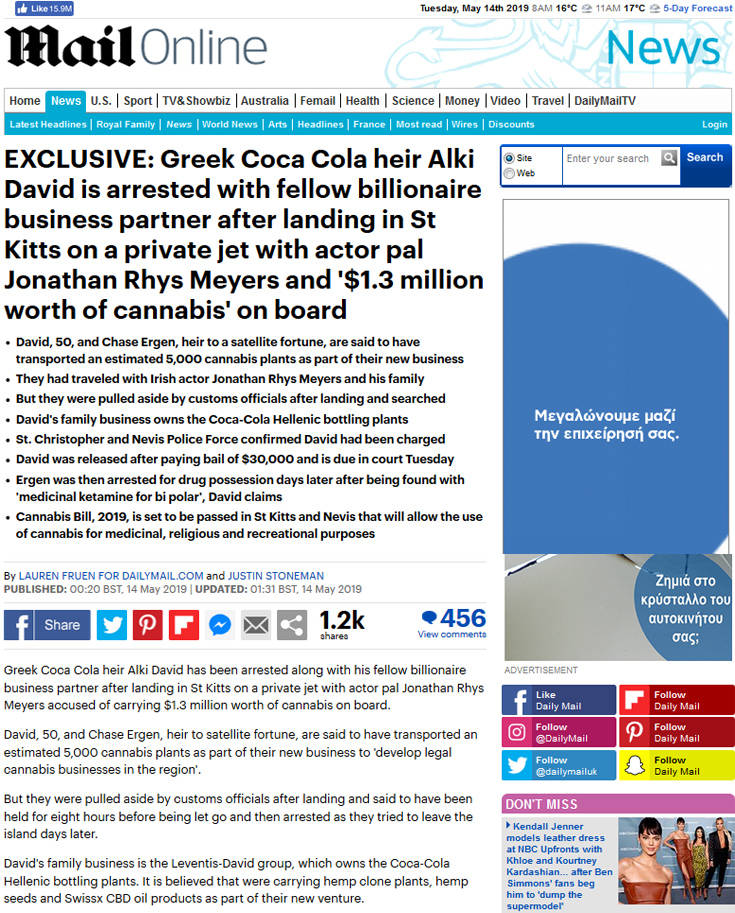 Περιπέτειες για τον Ελληνοκύπριο δισεκατομμυριούχο Άλκη Δαυίδ, ο οποίος συνελήφθη μαζί με τον επίσης δισεκατομμυριούχο συνέταιρό του Chase Ergen αμέσως μετά την προσγείωση στο νησί St Kitts στην Καραϊβική, όπου έφτασε με ιδιωτικό αεροσκάφος, κατηγορούμενος ότι μετέφερε κάνναβη αξίας 1,3 εκατομμυρίων δολαρίων, όπως γράφει σε δημοσίευμά της η Daily Mail. Μαζί τους ήταν και γνωστός ηθοποιός Jonathan Rhys Meyers.