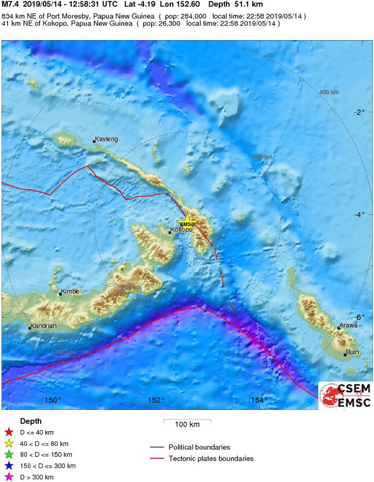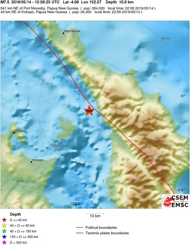 Σύμφωνα με το Ευρωμεσογειακό Ινστιτούτο η δόνηση ήταν 7,5 βαθμών της κλίμακας ρίχτερ ενώ το εστιακό βάθος εντοπίστηκε στα 10 χλμ. Το επίκεντρο εντοπίστηκε 45 χιλιόμετρα βόρεια-βορειοανατολικά της πόλης Κοκοπό στην επαρχία της ανατολικής Νέας Βρετανίας.