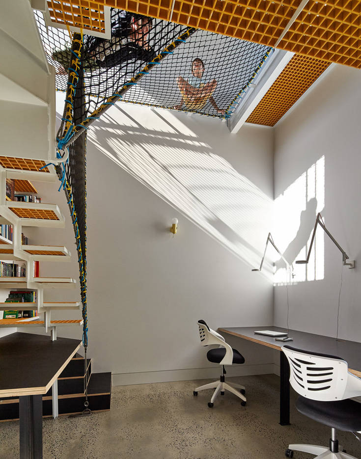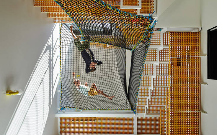 Εσωτερικά ακολουθείται η ίδια δομική αρχή, ένας ενιαίος χώρος δηλαδή που διαχωρίζεται εφευρετικά σε δωμάτια και γωνιές. Και παντού υπάρχει φυσικά κι ένας κρυμμένος παιδότοπος, από δίχτυα στο ταβάνι μέχρι και σκάλες στην κουζίνα.