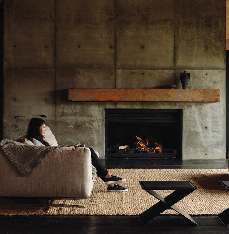 Η πρόσβαση στο εσωτερικό γίνεται από τις τεράστιες τζαμένιες επιφάνειες, όπου κυριαρχεί πια το μπετό και οι ρουστίκ πινελιές ξύλου σε πάτωμα και ταβάνι.