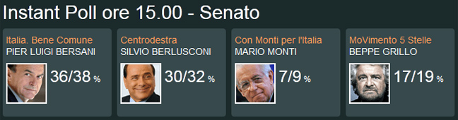 Επιπλέον, στο exit poll της RAI, ο Μπερσάνι συγκεντρώνει το 35%-37% των εδρών στη βουλή ενώ ο Μπερλουσκόνι το 29%-31%. Στο 19%-21% βρίσκεται το Κίνημα 5 Αστέρων του Γκρίλο και στο 8%-10 % ο Μόντι.