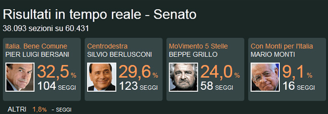 Οι προβολές εκλογικού αποτελέσματος διαψεύδουν τα exit poll στην καθοριστική μάχη της Γερουσίας. Ο Σίλβιο Μπερλουσκόνι συγκεντρώνει με βάση τις τελευταίες πληροφορίες που μεταδίδει η La Repubblica, ποσοστό 29,6% και 123 έδρες, ενώ ο Μπερσάνι 32,5% και 104 έδρες. Τρίτος αναδεικνύεται ο Μπέπε Γκρίλο με ποσοστό 24% και 58 έδρες.