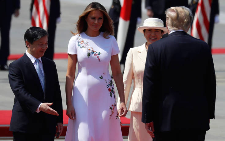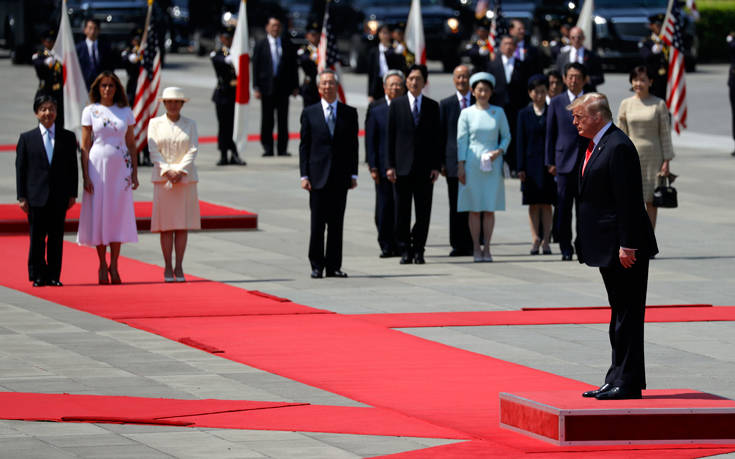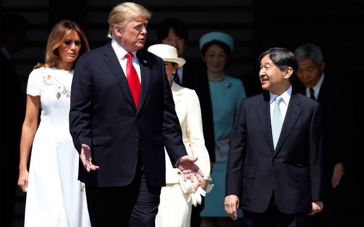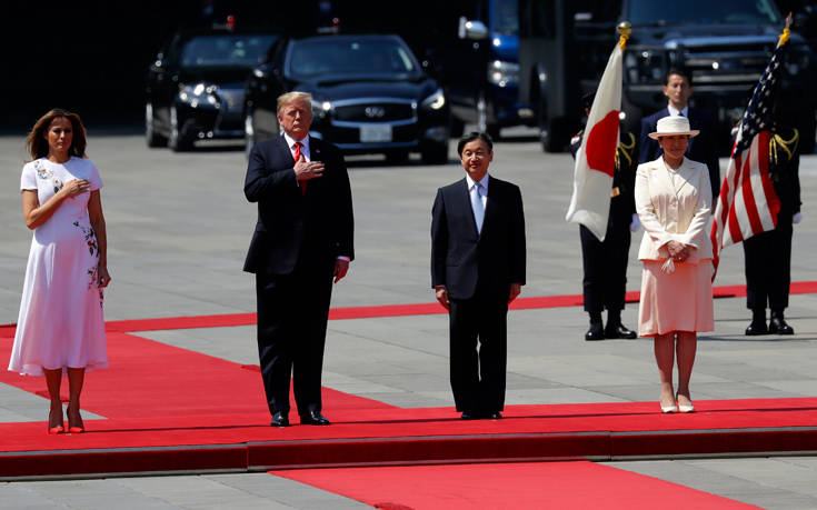 Ο Τραμπ, ο οποίος βρίσκεται σε τετραήμερη επίσκεψη στην Ιαπωνία, έγινε δεκτός από τον αυτοκράτορα και την αυτοκράτειρα Μασάκο στο παλάτι του Τόκιο.