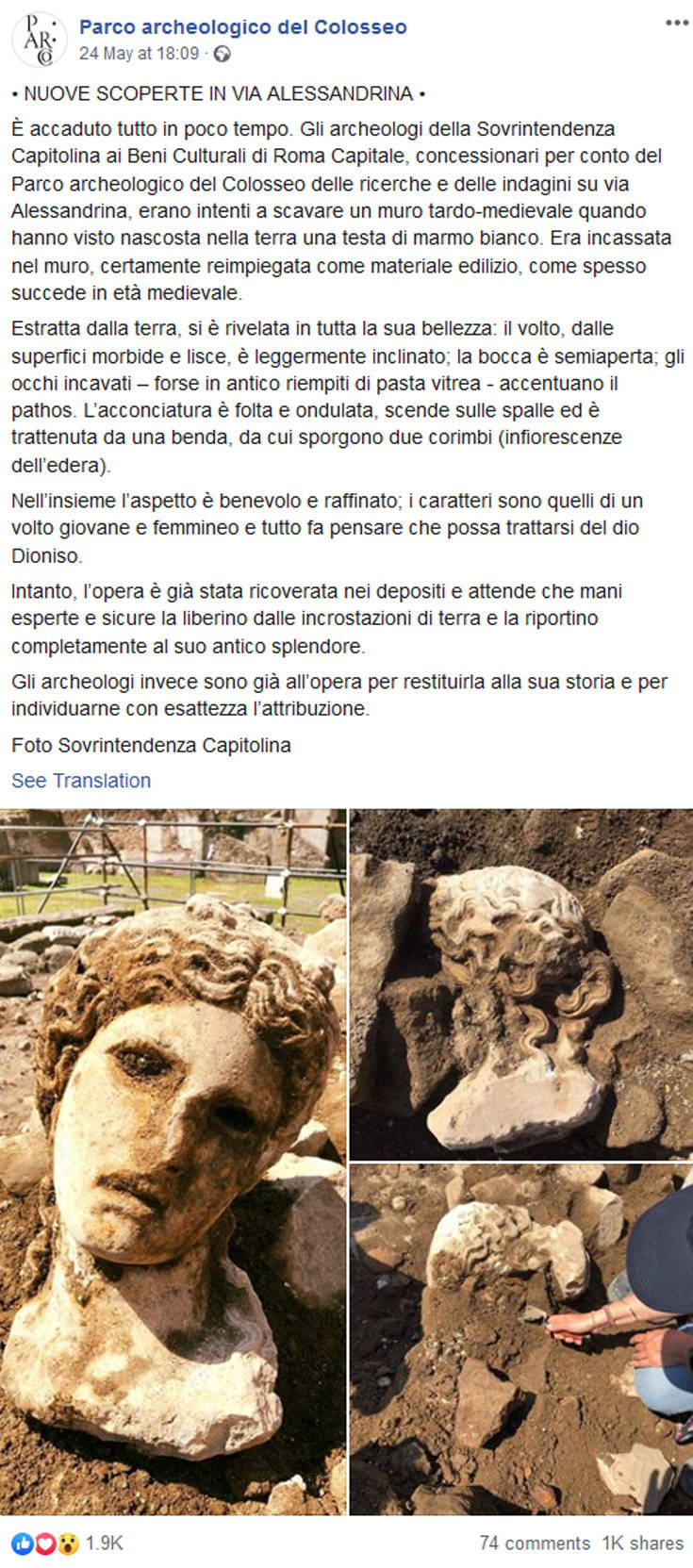«Οι αρχαιολόγοι έκαναν ανασκαφές σε ένα μεσαιωνικό τείχος όταν είδαν, κρυμμένο μέσα στη γη, ένα κεφάλι από λευκό μάρμαρο. Ήταν χτισμένο μέσα στο τείχος, συνιστώντας κατασκευαστικό υλικό, όπως συνέβαινε συχνά τον Μεσαίωνα. Μόλις ανασύρθηκε από το έδαφος, αποκαλύφθηκε όλο το μεγαλείο της ομορφιάς του. Το πρόσωπο είναι εκλεπτυσμένο, ευγενικό, νεαρό και θηλυκό, στοιχεία που μας κάνουν να πιστεύουμε πως θα μπορούσε να απεικονίζει τον Διόνυσο. Το κεφάλι θα καθαριστεί και στη συνέχεια θα εκτεθεί», ανέφερε στην ανακοίνωσή του το Αρχαιολογικό Πάρκο του Κολοσσαίου.
