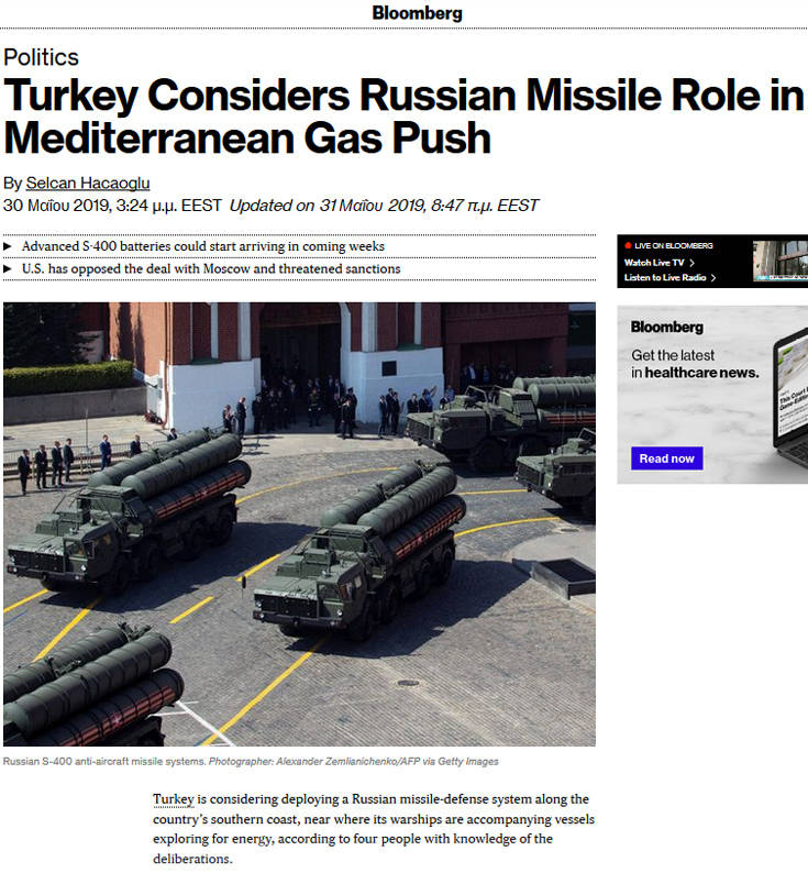 Το ενδεχόμενο ανάπτυξης του ρωσικού συστήματος αντιπυραυλικής άμυνας S-400 κατά μήκος των νότιων ακτών της Τουρκίας, κοντά στα οποία το τουρκικό Πολεμικό Ναυτικό συνοδεύει τα σκάφη που κάνουν έρευνες για φυσικό αέριο, αναφέρει δημοσίευμα του Bloomberg.