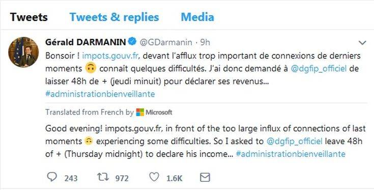 Σύμφωνα με τον αρμόδιο υπουργό Gérald Darmanin, υπήρξαν τέσσερα εκατομμύρια Γάλλοι που επιχείρησαν να κάνουν λίγο πριν τη λήξη της προθεσμίας ηλεκτρονική υποβολή. Κατά τον ίδιο, το φαινόμενο οφείλεται σε πολλούς παράγοντες, όπως το ότι είχε προηγηθεί Σαββατοκύριακο, αλλά και στο ότι αυξάνεται ο αριθμός των φορολογούμενων που κάνουν ηλεκτρονικά τη δήλωσή τους.