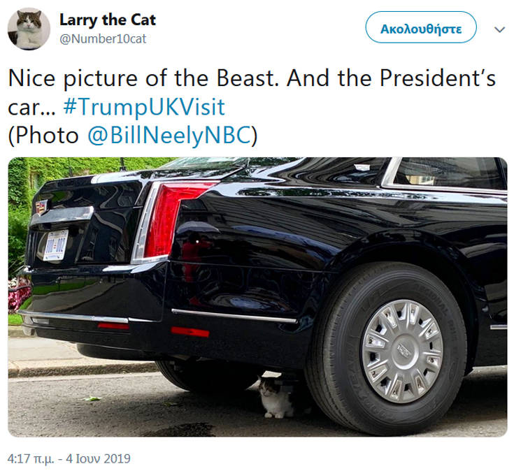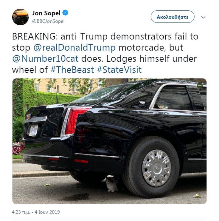 Όπως αναφέρει το Vox, όταν το προεδρικό ζεύγος των ΗΠΑ έφτασε στην πρωθυπουργική κατοικία της Τερέζα Μέι στην οδό Ντάουνινκγ 10, ένα μικρό γατάκι κρύφτηκε κάτω από τη λιμουζίνα του Τραμπ, το περίφημο «Κτήνος».