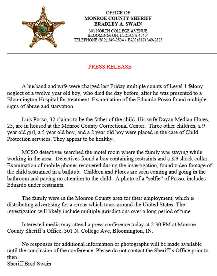 Σύμφωνα με το κατηγορητήριο, το λουρί ήταν δεμένο γύρω από τη μπάρα για τις πετσέτες, στο μπάνιο του μοτέλ, και ο Posso με τη Medina-Floresτον άφηναν το αγόρι ολομόναχο έτσι δεμένο για να μοιράσουν φυλλάδια για το περιπλανώμενο τσίρκο στο οποίο δούλευαν.