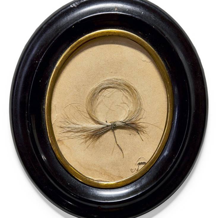 Η μπούκλα των μαλλιών, για την οποία ο Sotheby’s βεβαιώνει ότι είναι «αναμφίβολα ανθρώπινη», είναι δεμένη με μεταξωτή κλωστή και φυλάσσεται σε οβάλ καλογυαλισμένη κορνίζα του 19ου αιώνα.
