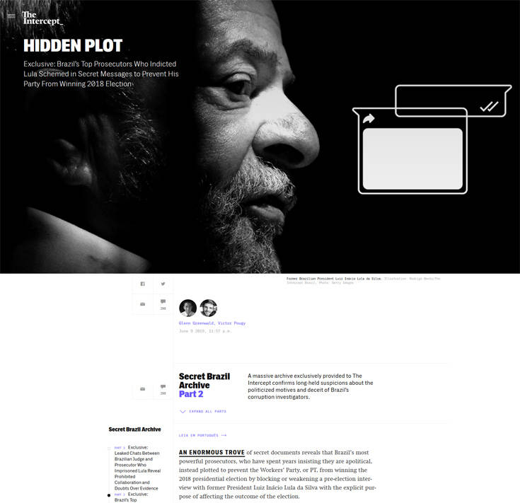 «Ενώ για καιρό διαβεβαίωναν πως είναι απολιτικοί και κίνητρό τους είναι μόνο η μάχη κατά της διαφθοράς, οι εισαγγελείς του Πλυσίματος Εξπρές στην πραγματικότητα συνωμότησαν μεταξύ τους σχετικά με τα μέσα για να εμποδιστεί η επιστροφή στην εξουσία του Λούλα και του κόμματός του, του Κόμματος των Εργαζομένων» καταγγέλλει το Intercept.