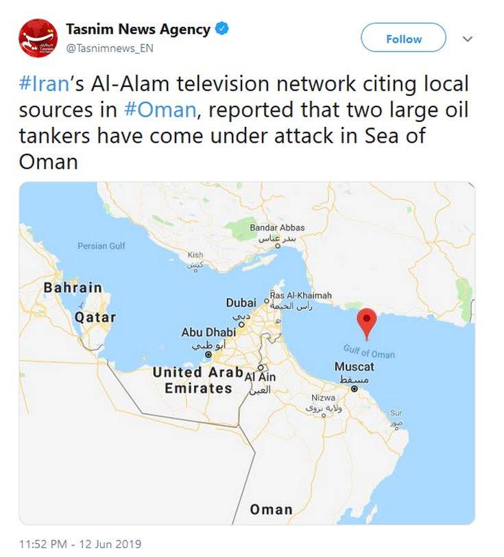 Το πρακτορείο Tasnim του Ιράν αναφέρει πως σύμφωνα με τον ιρανικό τηλεοπτικό σταθμό Al-Alam που επικαλείται τοπικές πηγές στο Ομάν, αναφέρει πως δύο μεγάλα τάνκερ έχουν δεχθεί επίθεση.