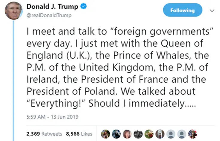 «Μιλάω καθημερινά με “ξένες κυβερνήσεις”. Μόλις συναντήθηκα με τη βασίλισσα της Αγγλίας, τον Πρίγκιπα των Φαλαινών, την πρωθυπουργό της Βρετανίας, τον Γάλλο πρόεδρο και τον Πολωνό πρόεδρο», έγραφε στο κείμενο αυτό ο 45ος πρόεδρος των ΗΠΑ.