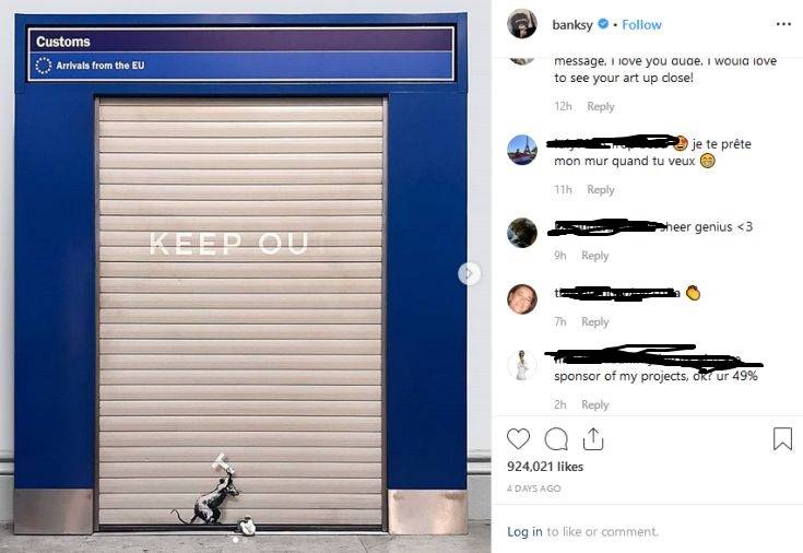 Ο ανώνυμος Βρετανός καλλιτέχνης δρόμου Banksy παρουσίασε ακόμη ένα έργο του εκφράζοντας την αποστροφή του για την απόφαση του Ηνωμένου Βασιλείου να αποχωρήσει από την Ευρωπαϊκή Ένωση. Η καινούργια παρέμβαση-δήλωση του Banksy βρίσκεται σε μια πύλη αφίξεων ταξιδιωτών από την ΕΕ στο αεροδρόμιο Χίθροου, φέρει την επωνυμία «Keep Ou» και είναι μέρος της θερινής έκθεσης της Βασιλικής Ακαδημίας στο Λονδίνο.
