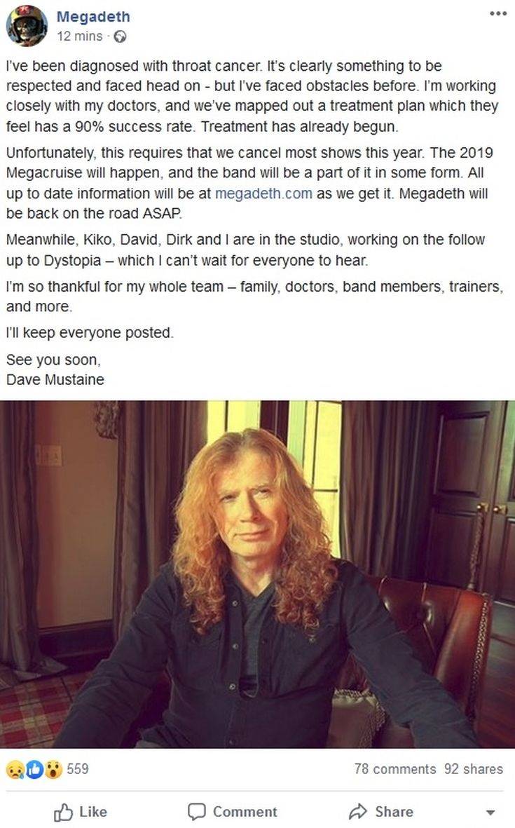 Με ένα μήνυμά του στο facebook πριν από λίγα λεπτά ο Dave Mustaine, ο τραγουδιστής των θρυλικών Megadeth, ενημέρωσε τους οπαδούς του συγκροτήματος για τον προσωπικό του γολγοθά.