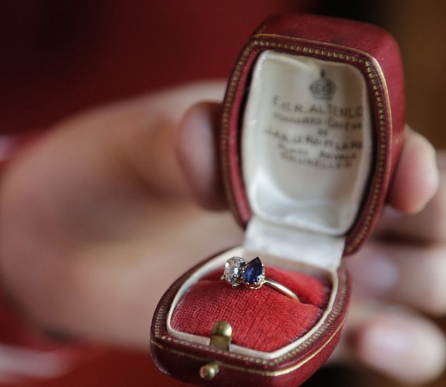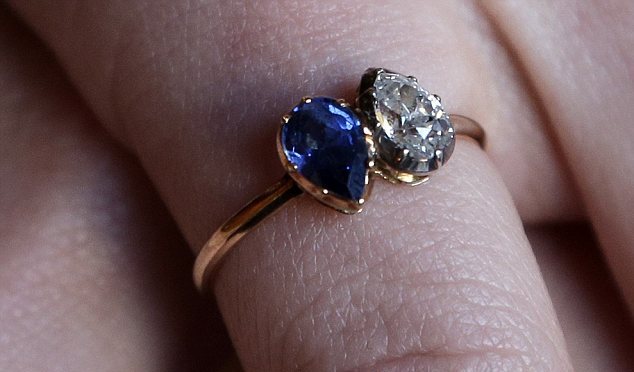 Το δαχτυλίδι αποτελείται από δύο πολύτιμους λίθους σε σχήμα δάκρυ, ένα διαμάντι και ζαφείρι, δεμένα επάνω σε μια χρυσή βέρα.
