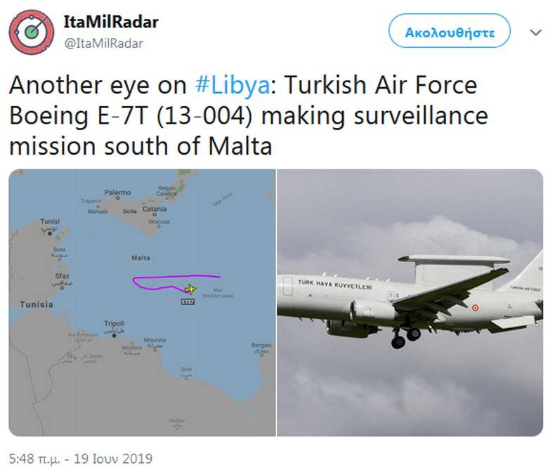 Για πτήση του τουρκικού ιπτάμενου ραντάρ βόρεια της πρωτεύουσας της Λιβύης και νότια της Μάλτας, κάνει λόγο τόσο δημοσίευμα στον Λιβυκό Τύπο όσο και της ιταλικής ιστοσελίδας ItaMilRadar που ειδικεύεται σε θέματα «παρακολούθησης του έργου της εναέριας κυκλοφορίας πάνω από την Ιταλία και την Μεσόγειο».