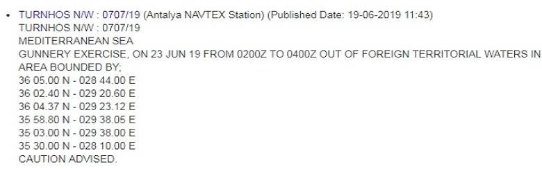 Με παράνομη NAVTEX η Άγκυρα δέσμευσε για την ημέρα των δημοτικών εκλογών της Κωνσταντινούπολης την ίδια περιοχή, νότια του Καστελόριζου και ανατολικά της Ρόδου, που είχε δεσμεύσει και για χθες.