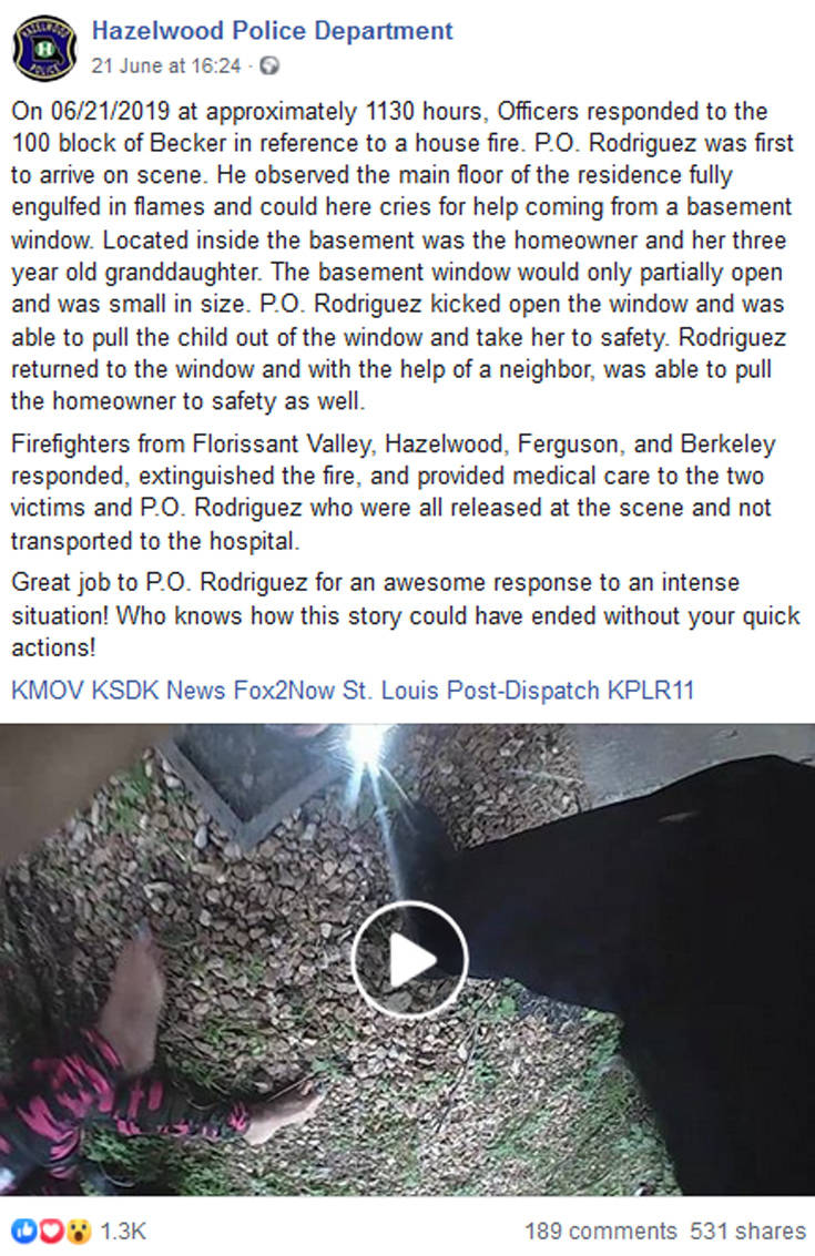 Άγιο είχαν ένα τρίχρονο κορίτσι και η γιαγιά του, που παγιδεύτηκαν μέσα σε σπίτι όπου είχε ξεσπάσει φωτιά, στο Σεντ Λούις, στο Μιζούρι. Εν προκειμένω, ο «άγιος» ήταν ένας αστυνομικός με γρήγορα αντανακλαστικά, που κατάφερε να απεγκλωβίσει τη γυναίκα και το κοριτσάκι τραβώντας τες από ένα παράθυρο του υπογείου.
