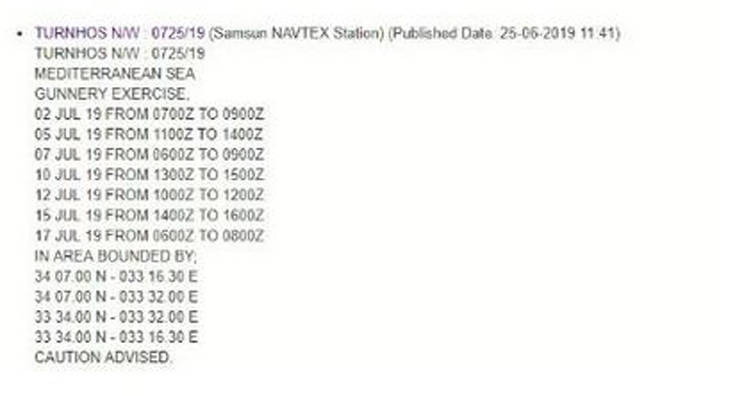 H νέα «εξαγγελία προς ναυτιλλομένους» αφορά περιοχές που βρίσκονται σε κυπριακά χωρικά ύδατα για επτά διαφορετικές ημερομηνίες από τις 2 έως 17 Ιουλίου.