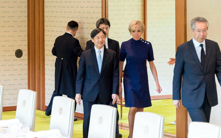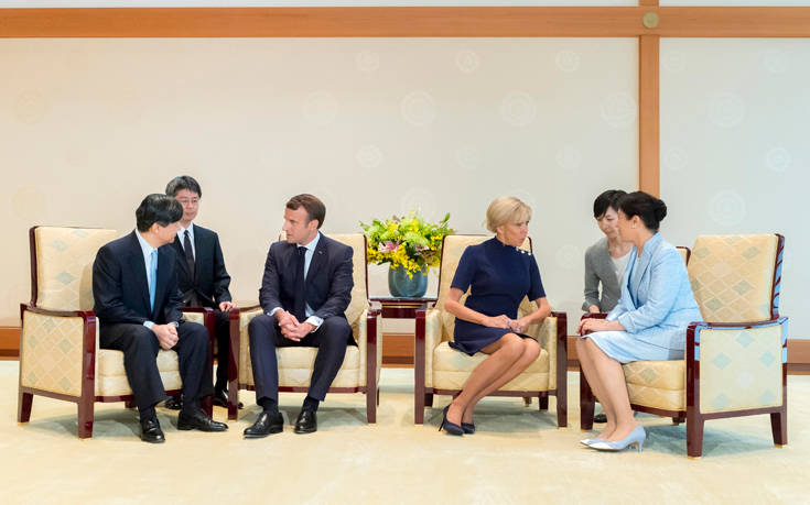 Σε μια λιτή ατμόσφαιρα, αλλά ταυτοχρόνως και με κάθε επισημότητα, ο Εμανουέλ Μακρόν και η σύζυγός του, Μπριζίτ, έγιναν δεκτοί σήμερα για γεύμα από τον νέο αυτοκράτορα της Ιαπωνίας, Ναρουχίτο, στα ανάκτορα στο κέντρο του Τόκιο.