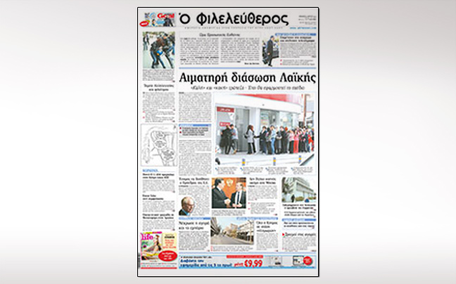 Το πρωτοσέλιδο θέμα του Φιλελεύθερου με τίτλο «Αιματηρή διάσωση Λαϊκής» αναφέρεται στο σχέδιο διάσωσης που ενέκρινε η κυβέρνηση. Όπως αναφέρεται, με το σχέδιο διασφαλίζεται ότι την ερχόμενη Τρίτη που θα ανοίξουν οι τράπεζες, τα καταστήματα της Λαϊκής θα λειτουργήσουν. Η τράπεζα, σημειώνεται, θα διαχωριστεί σε «καλή», που θα συμπεριλάβει τις ασφαλισμένες καταθέσεις μέχρι 100.000 ευρώ και τα εξυπηρετούμενα δάνεια και την «κακή» που θα αναλάβει τα προβληματικά και τις υπόλοιπες καταθέσεις, αναφέρει το Αθηναϊκό Πρακτορείο Ειδήσεων.