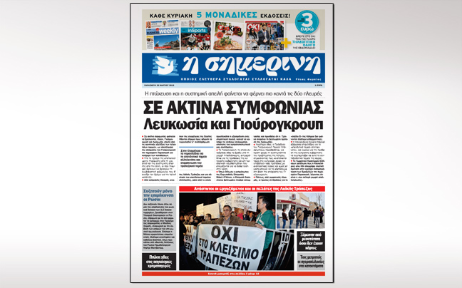 «Η Σημερινή», με τίτλο «Σε ακτίνα συμφωνίας Λευκωσία και Eurogroup» γράφει ότι, αν το νομοσχέδιο για τη Λαϊκή εγκριθεί από τη βουλή, η Κύπρος γλιτώνει την άτακτη χρεοκοπία, οι μέτοχοι χάνουν τις επενδύσεις τους, οι εργαζόμενοι παραμένουν στις δουλειές τους και οι μεγαλοκαταθέτες κουρεύονται σε βάθος χρόνου.