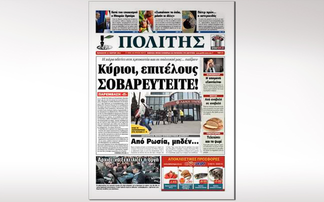 Η εφημερίδα «Πολίτης» σε κύριο άρθρο της, με τίτλο «Κύριοι, επιτέλους σοβαρευτείτε!», αναφέρει: «Έχουμε περιθώρια μέχρι την Τρίτη το πρωί αλλά από τις μέχρι τώρα κινήσεις των πολιτικών μας ουδείς έχει πειστεί ότι υπάρχει η αναγκαία προετοιμασία-για να μην πούμε σοβαρότητα-ότι καλώς οδεύουμε». Στο άρθρο επισημαίνεται ότι διακρίνεται μια υπόγεια διάσπαση της πολιτικής ηγεσίας επί «ενός εντελώς ανεπίκαιρου και επικινδύνου ερωτήματος: παραμονή στην ΕΕ ή σύναψη συμμαχίας με τη Ρωσία;» Ο «Πολίτης» καλεί τον Πρόεδρο της Δημοκρατίας να κυβερνήσει και τους αρχηγούς των πολιτικών κομμάτων να αναλάβουν τις ευθύνες τους και να παράγουν από κοινού με τον Πρόεδρο λύσεις. «Ουδόλως μας ενδιαφέρει αν για πρώτη φορά το έως τώρα ανεύθυνο πολιτικό μας σύστημα τίθεται ενώπιων άμεσων αποφάσεων η λήψη των οποίων ίσως αναγκάσει και να αυτοαναιρεθούν. Την ερχόμενη Τρίτη θέλουμε ο ήλιος πάνω από την Κύπρο να ανατείλει στέλλοντας μηνύματα ελπίδας», καταλήγει το άρθρο.