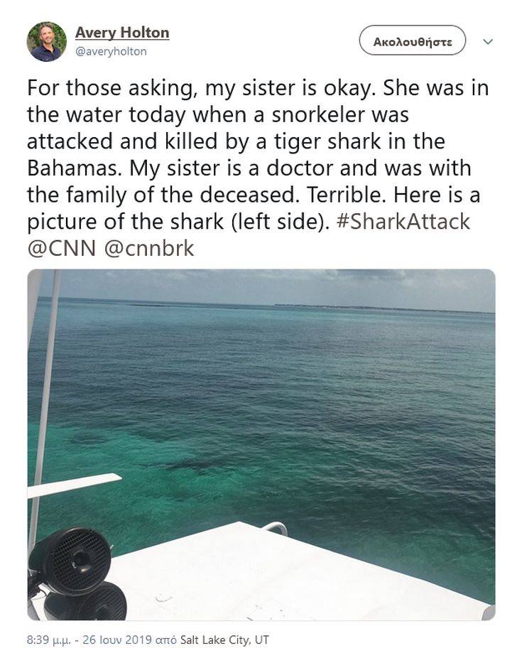 Στο ίδιο πλοιάριο ήταν και μια γιατρός η οποία είχε κάνει κατάδυση 45 λεπτά πριν εμφανιστούν οι καρχαρίες. Και το πιο πάνω tweet με την εικόνα του καρχαρία στ’ αριστερά πόσταρε ο αδερφός της στο twitter.