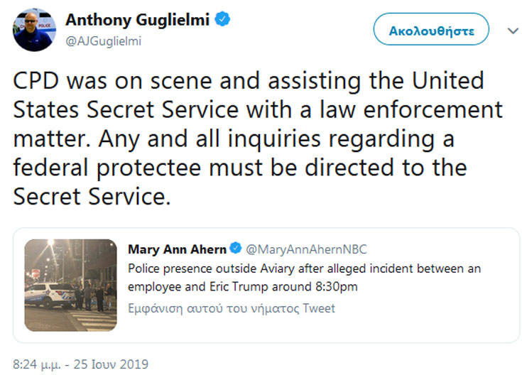 Μια εργαζόμενη σε εστιατόριο στο Σικάγο έφτυσε τον γιο του Ντόναλντ Τραμπ, Έρικ, την ώρα που εκείνος βρισκόταν εντός του καταστήματος, με τις μυστικές υπηρεσίες της χώρας να αναλαμβάνουν αμέσως δράση και να τη θέτουν υπό κράτηση. «Ήταν αηδιαστικό και προέρχεται από κάποιον που ξεκάθαρα έχει ψυχολογικά προβλήματα», δήλωσε ο γιος του προέδρου των ΗΠΑ.