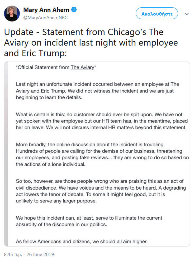 Για το περιστατικό δεν θα μπορούσε να μην τοποθετηθεί και ο ιδιοκτήτης του καταστήματος, ο Ελληνοαμερικανός Νικ Κοκονάς. «Είναι δεδομένο πως κανένας πελάτης δεν πρέπει να παθαίνει κάτι τέτοιο. Δεν μιλήσαμε με την εργαζόμενη, αλλά το έκανε η ομάδα ανθρώπινου δυναμικού της εταιρίας μας. Στο μεταξύ, τη θέσαμε σε διαθεσιμότητα», αναφέρεται σε γραπτή δήλωση του εστιατορίου «The Aviary».