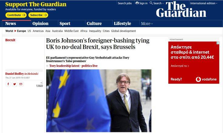 «Η συζήτηση ανάμεσα στους υποψήφιους επιβεβαιώνει ότι δεν διδάχθηκαν τίποτε από αυτά τα δύο χρόνια διαπραγματεύσεων με την Ευρωπαϊκή Ένωση» επισημαίνει στο άρθρο του ο Γκι Φερχόφστατ, αρμόδιος του Ευρωπαϊκού Κοινοβουλίου για το Brexit. «Αυτό δεν προκαλεί έκπληξη με δεδομένο ότι το φαβορί είναι ο Μπόρις Τζόνσον, ο σημαντικότερος αρχιτέκτονας της εκστρατείας για την έξοδο από την ΕΕ (στο δημοψήφισμα του 2016), ο άνθρωπος που συνεχίζει να αποκρύπτει γεγονότα, να υπερβάλλει και να παραπληροφορεί το κοινό σχετικά με το Brexit», γράφει.