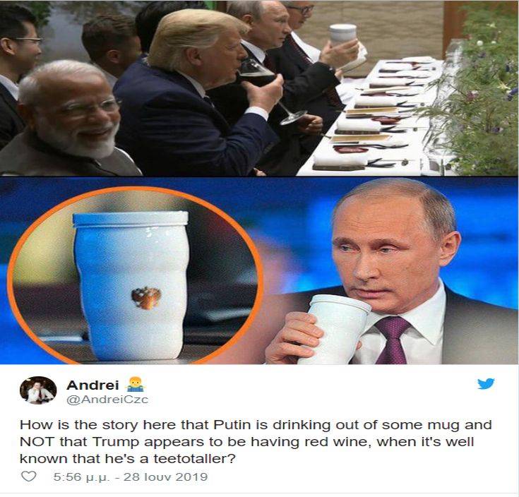 Οι εικόνες που έδειχναν τον Ρώσο Πρόεδρο να χρησιμοποιεί την δική του κούπα και να τσουγκρίζει με αυτή, κατά την διάρκεια της δεξίωσης στην σύνοδο κορυφής της G20, στην Οζάκα, προκάλεσε τόσα πολλά σχόλια στο διεθνή αλλά και το ρωσικό τύπο που το Κρεμλίνο δια στόματος του εκπροσώπου του Ρώσου προέδρου, Ντμίτρι Πεσκόφ «αναγκάστηκε να δώσει απάντηση».
