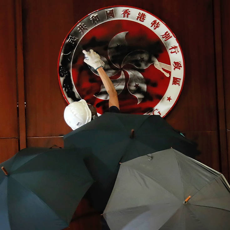 Κατά τη διάρκεια των επεισοδίων, ανήμερα της 22ης επετείου της παράδοσης της κυριαρχίας του Χονγκ Κονγκ από τη Βρετανία στην Κίνα, οι διαδηλωτές κατέστρεψαν πίνακες ζωγραφικής, έσπασαν πόρτες, έγραψαν συνθήματα στους τοίχους, εκφράζοντας την οργή τους για το προτεινόμενο νομοσχέδιο που θα ανοίγει τον δρόμο για τις απελάσεις υπόπτων στην Κίνα.