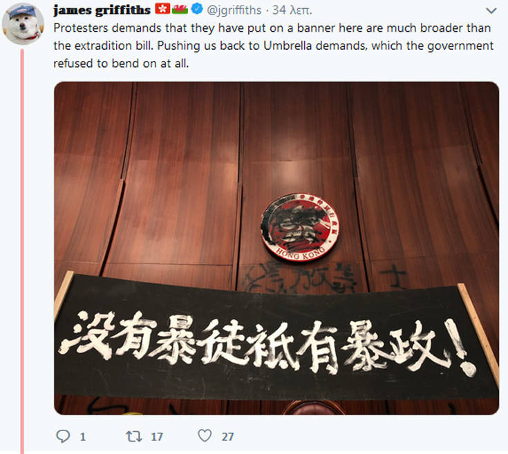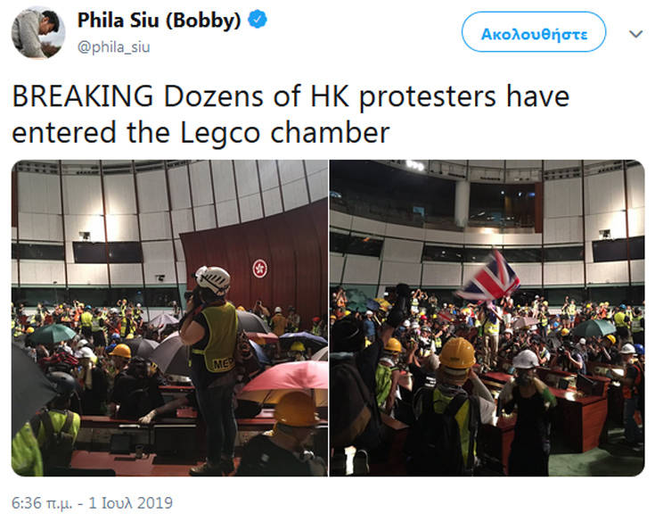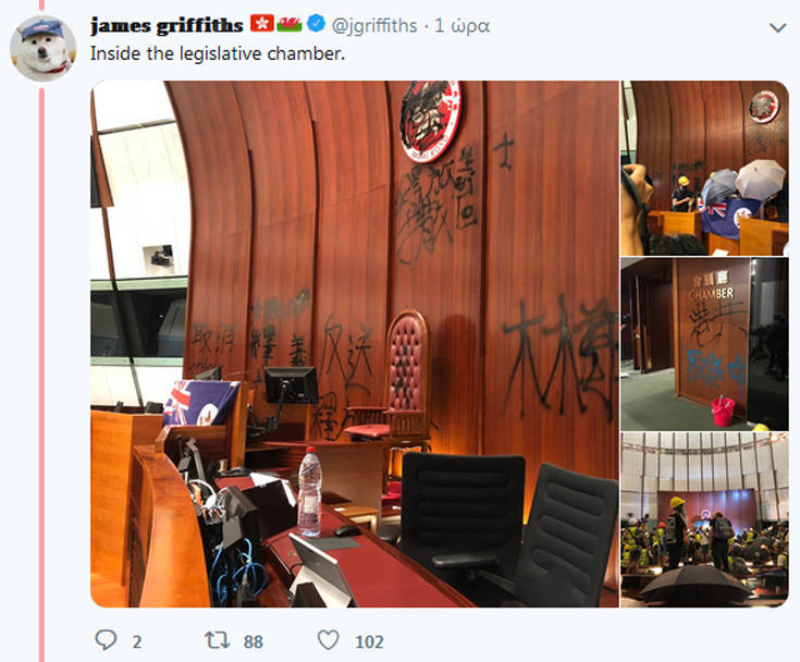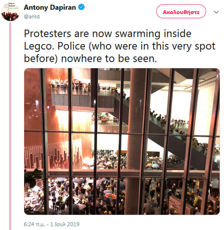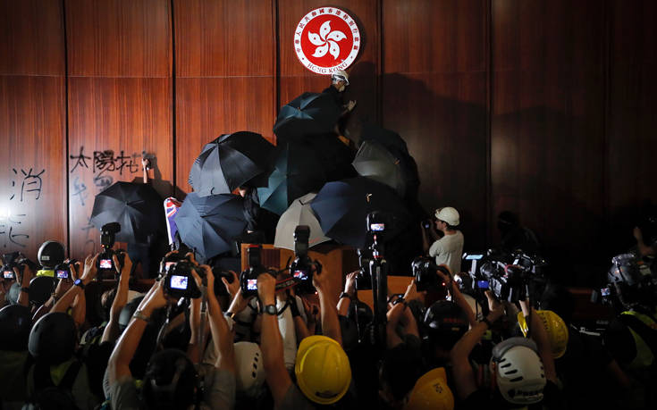 Δεκάδες άνθρωποι, με καλυμμένα τα πρόσωπά τους, πολλοί εκ των οποίων κρατώντας αυτοσχέδιες ασπίδες, διείσδυσαν στο Νομοθετικό Συμβούλιο (LegCo), καταφέρνοντας να μπουν έπειτα από προσπάθειες ωρών, μεταδίδει το τηλεοπτικό δίκτυο i-Cable News.
