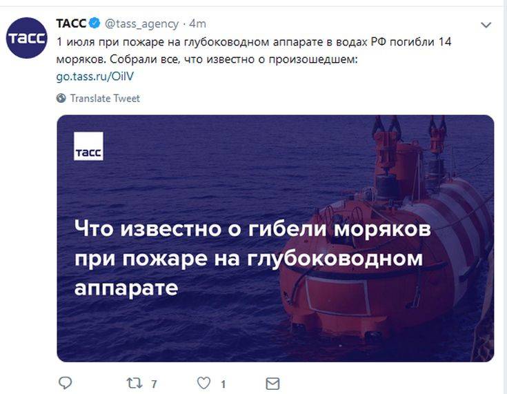 Το ρωσικό υπουργείο Άμυνας στην ανακοίνωσή του αναφέρει ότι «την 1η Ιουλίου στα ρωσικά χωρικά ύδατα 14 ναύτες υποβρυχίων που επέβαιναν σε επιστημονικό ερευνητικό βαθυσκάφος, που είχε αποστολή να μελετήσει τον θαλάσσιο χώρο κοντά στο πυθμένα και τον πυθμένα του Ειρηνικού για σκοπούς του Πολεμικού Στόλου της Ρωσίας, έχασαν την ζωή τους, όταν προκλήθηκε πυρκαγιά κατά την διάρκεια βιομετρικών μετρήσεων, με αποτέλεσμα να υποστούν δηλητηρίαση από τις αναθυμιάσεις».