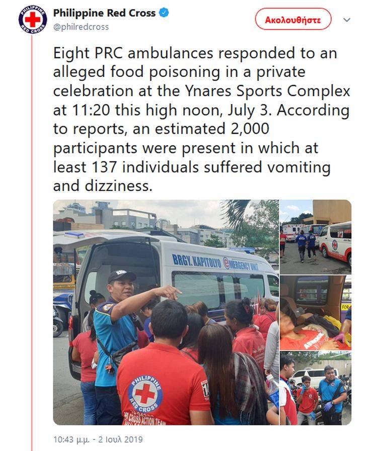 Ο Ερυθρός Σταυρός των Φιλιππίνων και τοπικός αξιωματούχος επεσήμαναν ότι τουλάχιστον 137 άνθρωποι χρειάστηκε να διακομιστούν σε νοσοκομεία στη διάρκεια του πάρτι που διοργανώθηκε σε ένα κλειστό στάδιο.