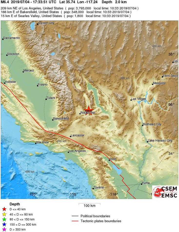 Μια πολύ ισχυρή σεισμική δόνηση μεγέθους 6,4 βαθμών Ρίχτερ σημειώθηκε σήμερα στη Νότια Καλιφόρνια, κοντά στην πόλη Ρίτζκρεστ, που απέχει 320 χιλιόμετρα βορειοανατολικά του Λος Άντζελες, όπως έγινε γνωστό από το Ευρωμεσογειακό Σεισμολογικό Κέντρο EMSC, σύμφωνα με το Αθηναϊκό Πρακτορείο Ειδήσεων.