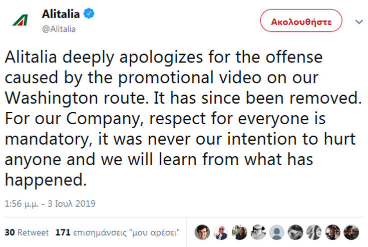 «Η Alitalia ζητά βαθύτατα συγγνώμη από όσους προσβλήθηκαν από το διαφημιστικό μας βίντεο για το δρομολόγιό μας στην Ουάσινγκτον», έγραψε στο Twitter η αεροπορική εταιρεία. «Το βίντεο έχει διαγραφεί. Για την εταιρεία μας ο σεβασμός σε όλους είναι υποχρεωτικός και δεν ήταν ποτέ πρόθεσή μας να πληγώσουμε κανέναν και θα μάθουμε από αυτό που συνέβη», πρόσθεσε.