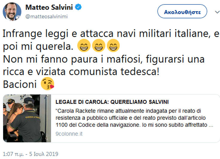 Την ίδια ώρα ο Ματέο Σαλβίνι απάντησε με ένα tweet στο γνωστό του ύφος. «Παραβιάζει το νόμο, επιτίθεται στα ιταλικά πλοία και μετά μου κάνει αγωγή. Δεν με τρομάζουν οι μαφιόζοι, πόσω μάλλον μια πλούσια και κακομαθημένη Γερμανίδα κομμουνίστρια. Πολλά φιλάκια!».