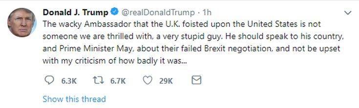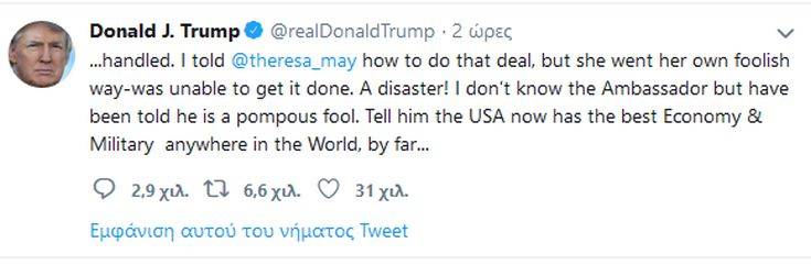Χθες (09.07.2019) ο Αμερικάνος πρόεδρος Ντόναλντ Τραμπ χαρακτήρισε τον Βρετανό πρεσβευτή στην Ουάσινγκτον «πολύ ηλίθιο τύπο», επαναλαμβάνοντας παράλληλα τις επιθέσεις του εναντίον της πρωθυπουργού Τερέζα Μέι και υποστηρίζοντας πως οι διαπραγματεύσεις για το Brexit ήταν μια «καταστροφή».