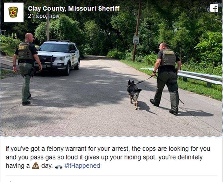 «Αν εκκρεμεί εναντίον σου ένταλμα σύλληψης, οι αστυνομικοί σε αναζητούν και αν αεριστείς τόσο δυνατά, αυτό προδίδει το κρησφύγετό σου και σίγουρα έχεις μια σκ… μέρα» έγραφε η ανάρτηση. Το τμήμα μάλιστα έδωσε στη δημοσιότητα φωτογραφία με αστυνομικούς που χρησιμοποιούσαν σκύλους σε δασική περιοχή ως μέρος της έρευνάς τους.