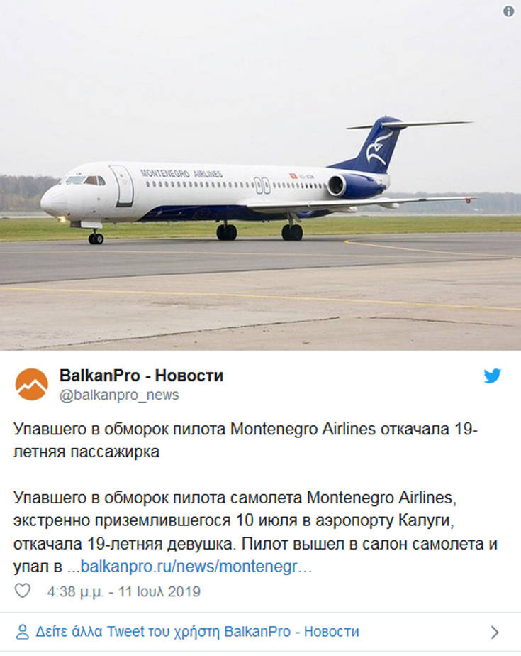 Χάος επικράτησε την ώρα πτήσης από το Tivat του Μαυροβουνίου προς το αεροδρόμιο Domodedovo της Μόσχας όταν ο πρώτος πιλότος μελάνιασε και έχασε τις αισθήσεις του.