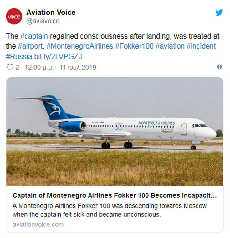 Ο πρώτος κυβερνήτης του αεροσκάφους τύπου Fokker 100 έχασε τις αισθήσεις του, προκαλώντας τρόμο στους 85 επιβάτες και τα 5 μέλη του πληρώματος. Σύμφωνα με το aviationvoice.com, μετά από κάποια λεπτά πανικού ο συγκυβερνήτης ανέλαβε δράση.