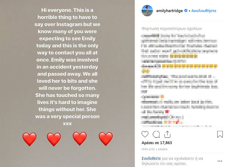 Η Έμιλι είχε ένα τραγικό δυστύχημα χθες και έφυγε από τη ζωή. Την αγαπάμε και δεν θα την ξεχάσουμε ποτέ. Άγγιξε τόσες πολλές ζωές και είναι δύσκολο να φανταστούμε τη ζωή χωρίς αυτήν. Ήταν ένα πολύ ξεχωριστό άτομο».